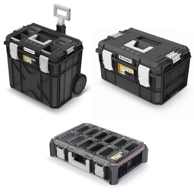 Le lot de 3 caisses de transport Peugeot StorageHub constitue la solution de stockage modulaire la plus complète pour les artisans et bricoleurs exigeants. Cet ensemble combine trois unités complémentaires — 12 L, 32 L et 65 L — créant un écosystème de transport vertical parfaitement stable et ultra-résistant.