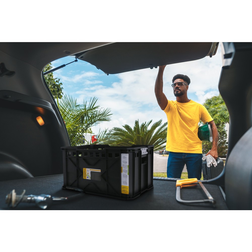 La StorageHub-4220 (réf 250715) vient s'empiler en toute sécurité pour augmenter votre capacité d'emport de 20 kg supplémentaires. Chaque caisse dispose de deux séparateurs amovibles équipés de liens de fixation élastiques, permettant de compartimenter l'espace tout en maintenant fermement vos outils pendant le transport.