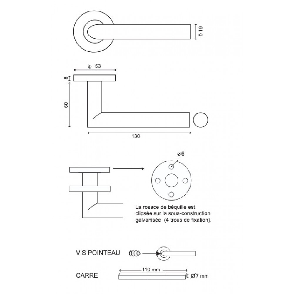Livrée avec carré de 7 mm pour porte d'épaisseur 40 mm et sans rosace de fonction.
