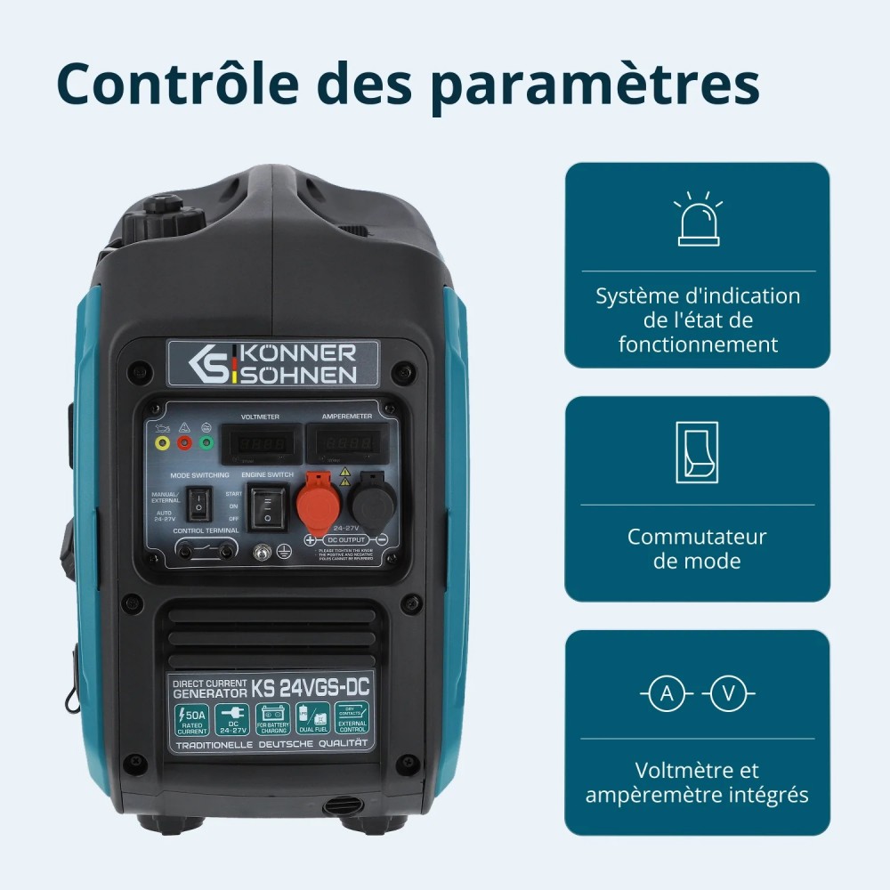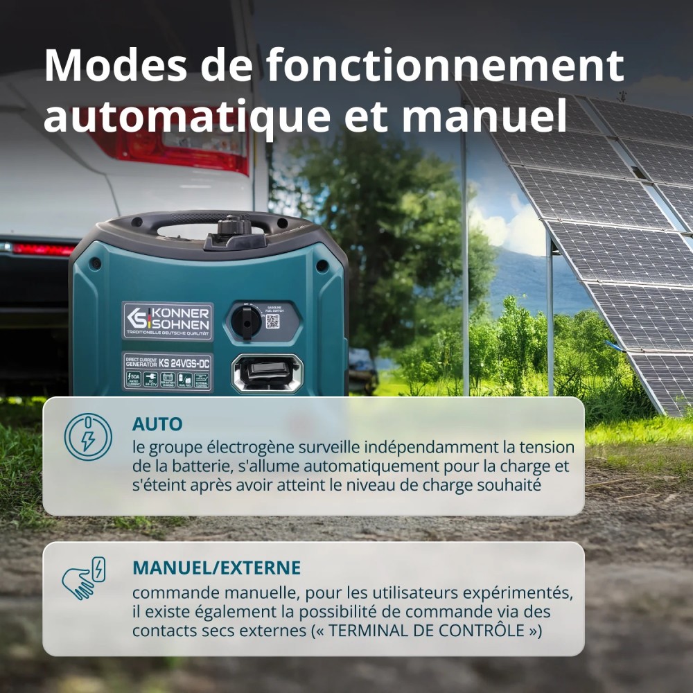 L'un des atouts majeurs du KS 24VGS-DC réside dans son intelligence opérationnelle. Le mode AUTO surveille en permanence la tension de votre parc de batteries : le groupe démarre automatiquement dès que les batteries sont déchargées et s'arrête de lui-même une fois la charge complète atteinte.