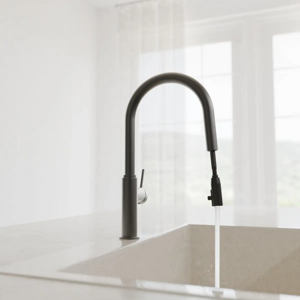 Le mitigeur BLACKPOOL en Graphite Mat est l'alternative parfaite au noir classique pour ceux qui recherchent une cuisine de caractère. Sa teinte gris profond et texturée offre un rendu haut de gamme tout en intégrant la technologie "Cold Start" pour une gestion responsable de l'énergie et une douchette extractible pour une liberté de mouvement totale.