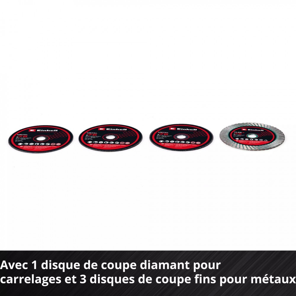Vendue sans batterie ni chargeur et avec une clé Allen, 1 disque de coupe diamant, 3 disques de coupes fin