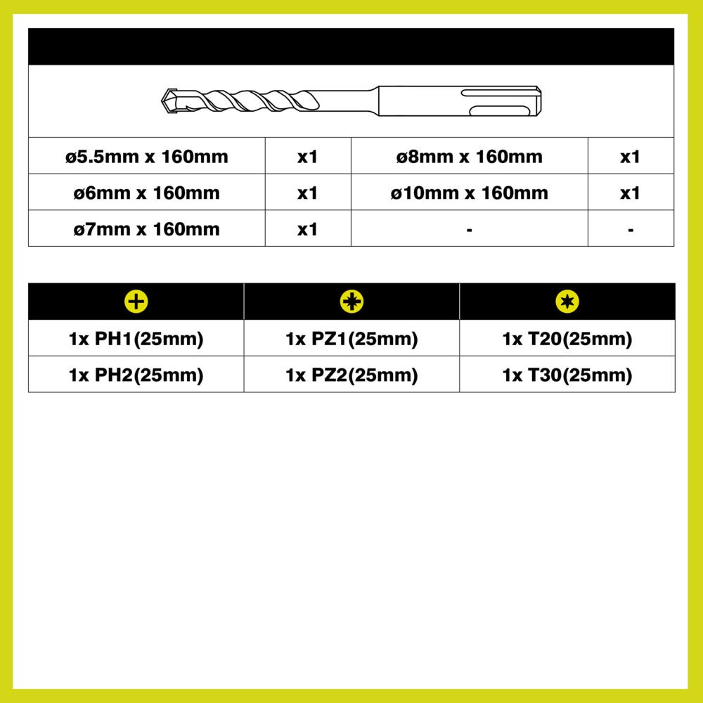 Livré avec 5 forets SDS+ 2 taillants et 6 embouts de vissage