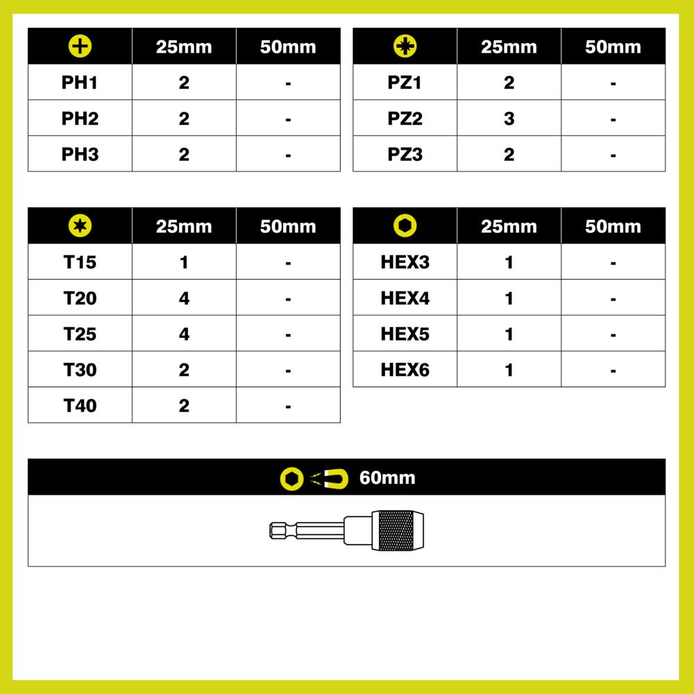 - 30 embouts de vissage à impact 25 mm (2 x PH1, 2 x PH2, 2 x PH3, 2 x PZ1, 3 x PZ2, 2 x PZ3, 1 x HEX3, 1 x HEX4, 1 x HEX5, 1 x HEX6, 1 x TX15, 4 x TX20, 4 x TX25, 2 x TX30, 2 x TX40) ;