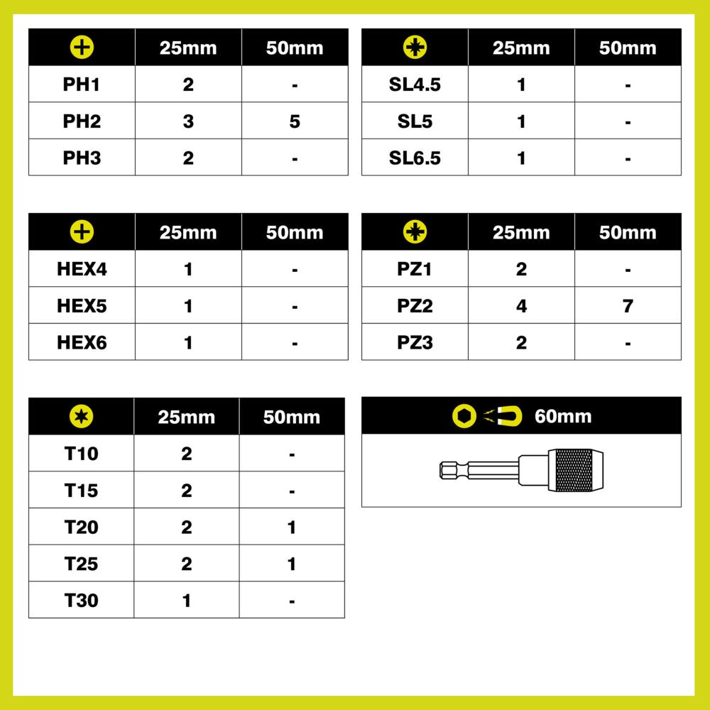 - 30 embouts de vissage à impact 25 mm (2 x PH1, 3 x PH2, 2 x PH3, 2 x PZ1, 4 x PZ2, 2 x PZ3, 2 x TX10, 2 x TX15, 2 x TX20, 2 x TX25, 1 x TX30, 1 x HEX4, 1 x HEX5, 1 x HEX6, 1 x SL4,5, 1 x SL5, 1 x SL6,5) ;