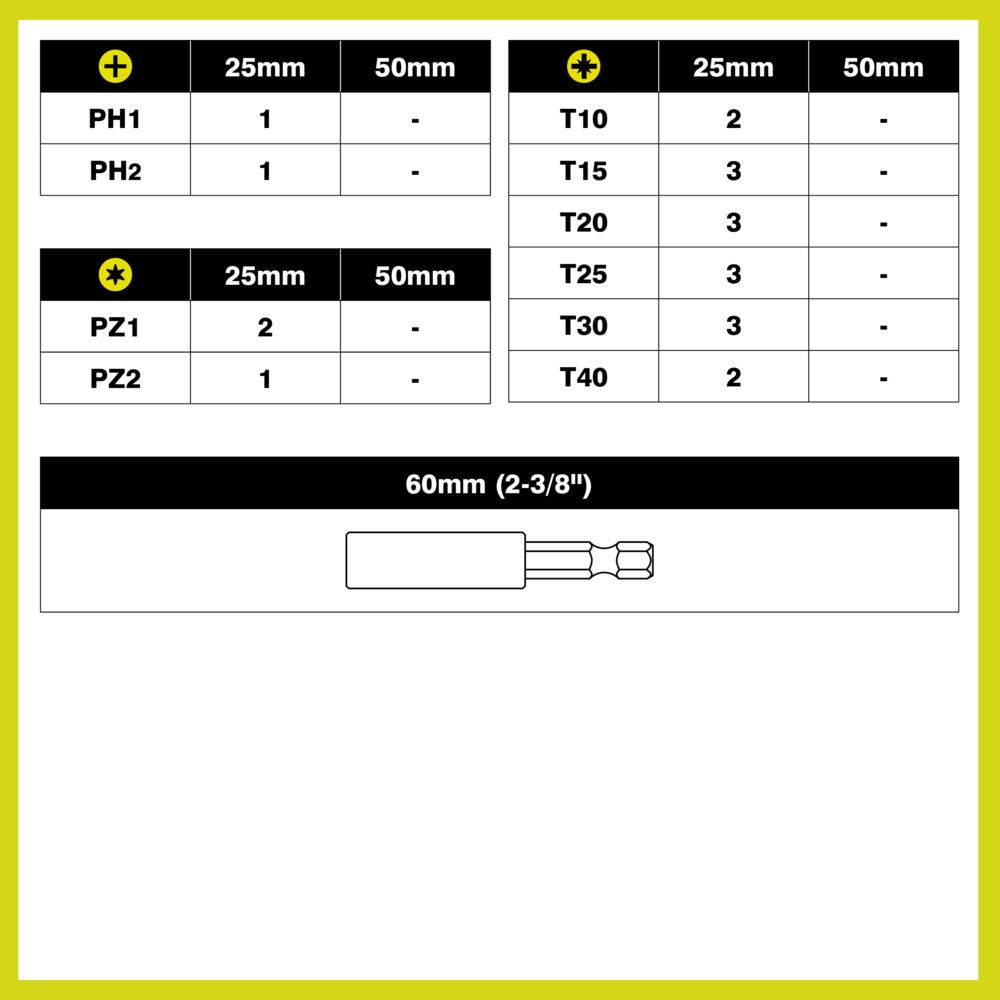 - 21 embouts de vissage à impact 25 mm (1 x PH2, 1 x PH3, 2 x PZ2, 1 x PZ3, 2 x TX10, 3 x TX15, 3 x TX20, 2 x TX25, 3 x TX30, 2 x TX40) ;