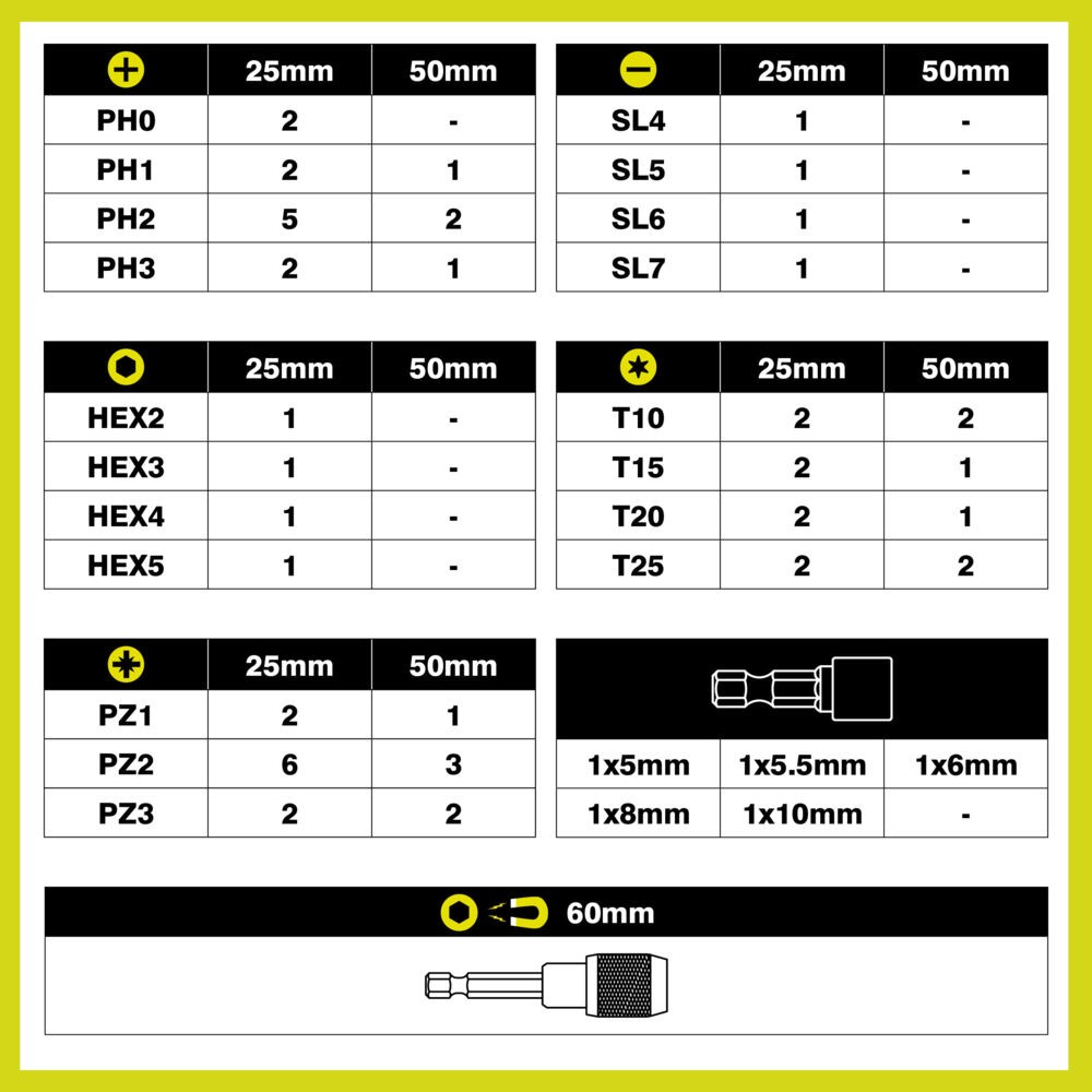 - 16 embouts de vissage à impact 50 mm (1 x PH1, 2 x PH2, 1 x PH3, 1 x PZ1, 3 x PZ2, 2 x PZ3, 2 x TX10, 1 x TX15, 1 x TX20, 2 x TX25) ;