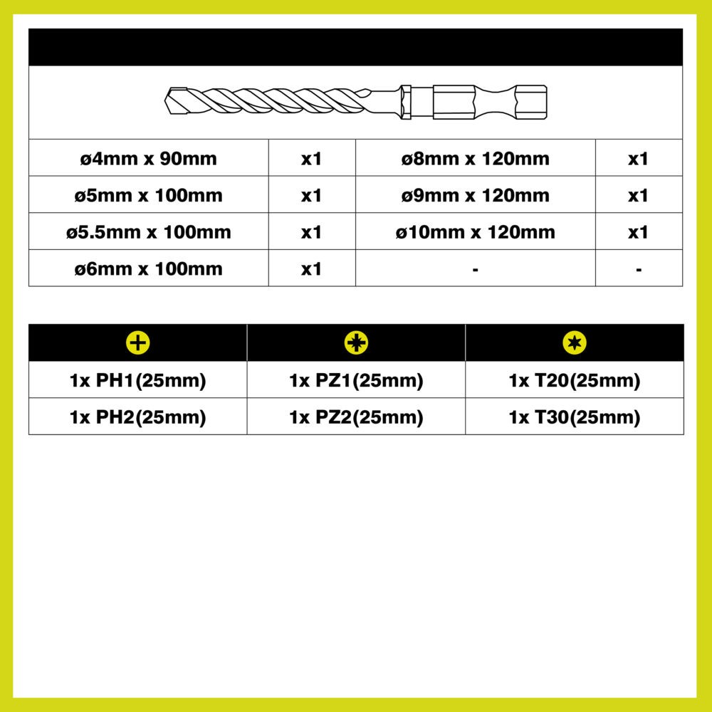 - 7 forets multi-matériaux (1 x 4 mm, 1 x 5 mm, 1 x 5,5 mm, 1 x 6 mm, 1 x 8 mm, 1 x 9 mm, 1 x 10 mm) ;