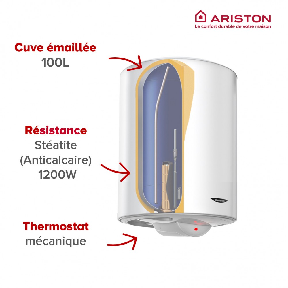 - Résistance stéatite : L'élément chauffant est inséré dans un fourreau protecteur, évitant tout contact avec l'eau. Cette technologie empêche l'entartrage de la résistance et permet son remplacement sans vidange de la cuve.