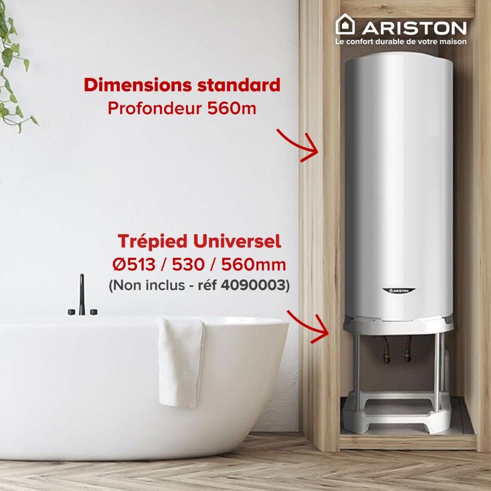 Le trépied universel inclus est obligatoire si votre chauffe-eau est installé sur une cloison légère (placo) ou un mur non porteur. Il supporte le poids de l'appareil plein (environ 200 kg) pour soulager les fixations murales.