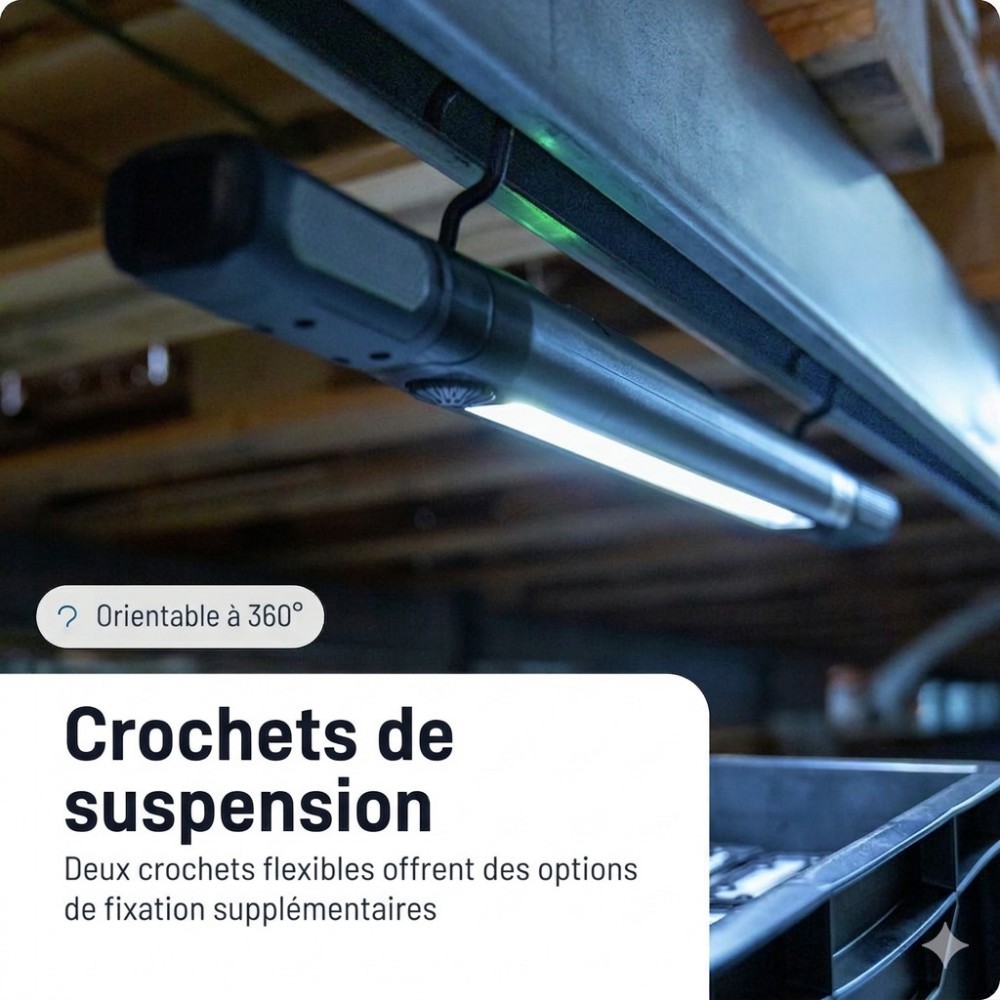 - Deux crochets escamotables et rotatifs au dos du boîtier pour suspendre la lampe partout.