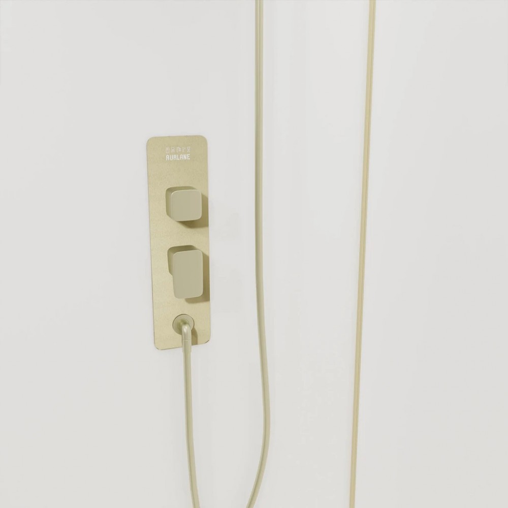 Chaque détail, des poignées métalliques à la bonde grand débit, est coordonné en or brossé. Cette unité de couleur crée une atmosphère de sérénité et de luxe, transformant une simple douche en un véritable moment de détente.