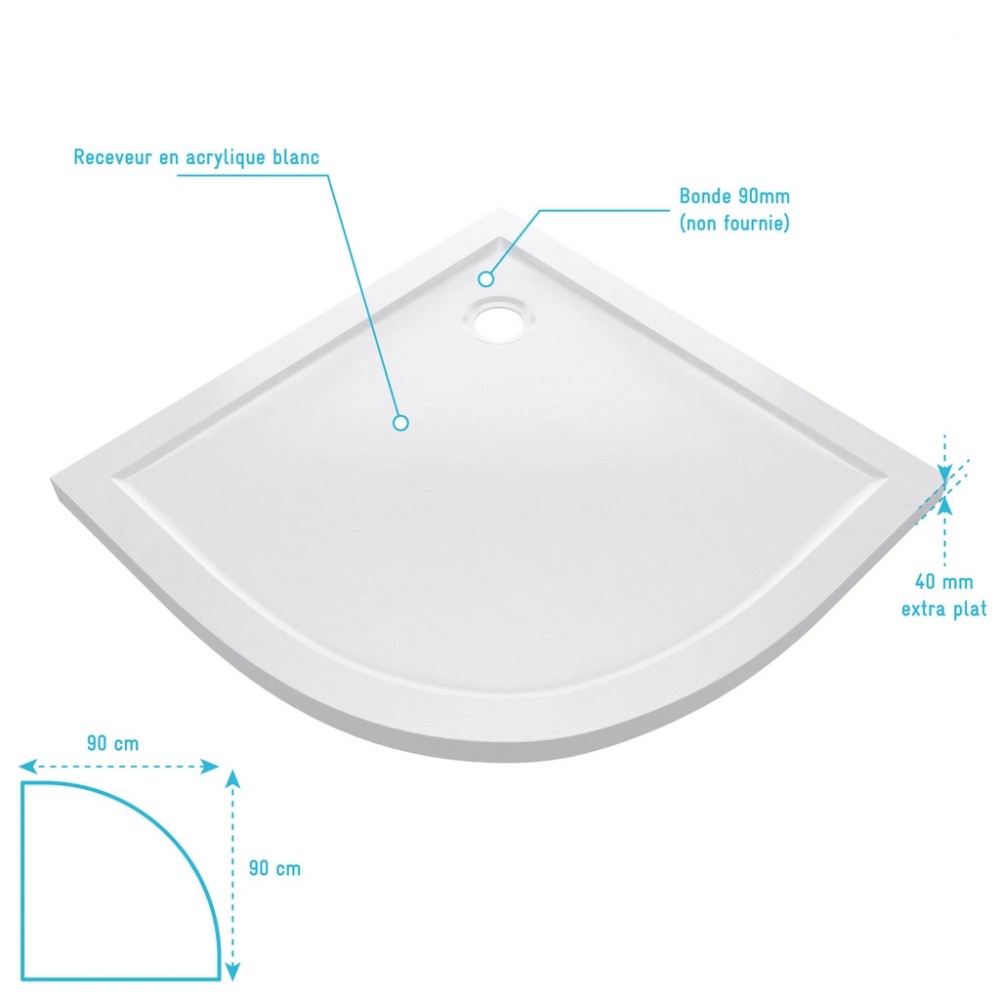 - Bonde de douche : Attention, ce receveur nécessite une bonde de 90 mm de diamètre pour assurer une évacuation rapide de l'eau. Celle-ci n'est pas incluse dans le pack standard.
