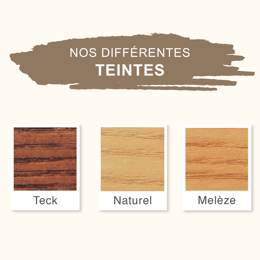 • Teinte : naturel (incolore) / Ipé / Teck / Mélèze/ Pin grisé / Vieux pin/ Chêne brulé
