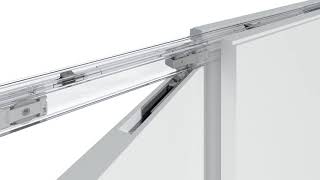 Grâce à un profil de réception prémonté, le rail de roulement peut être monté et démonté à tout moment par le biais de systèmes de fermeture à baïonnette autoserrants. Tous les composants restent librement accessibles et peuvent être remplacés ou complétés sans problème. Cela permet en outre à la surface de roulement du rail de ne pas s’encrasser pendant la phase de montage. Et comme le point de pivotement de la suspension située côté poche se trouve directement au niveau du bord de la porte lors du montage, la porte peut être introduite de façon particulièrement aisée dans la poche murale.