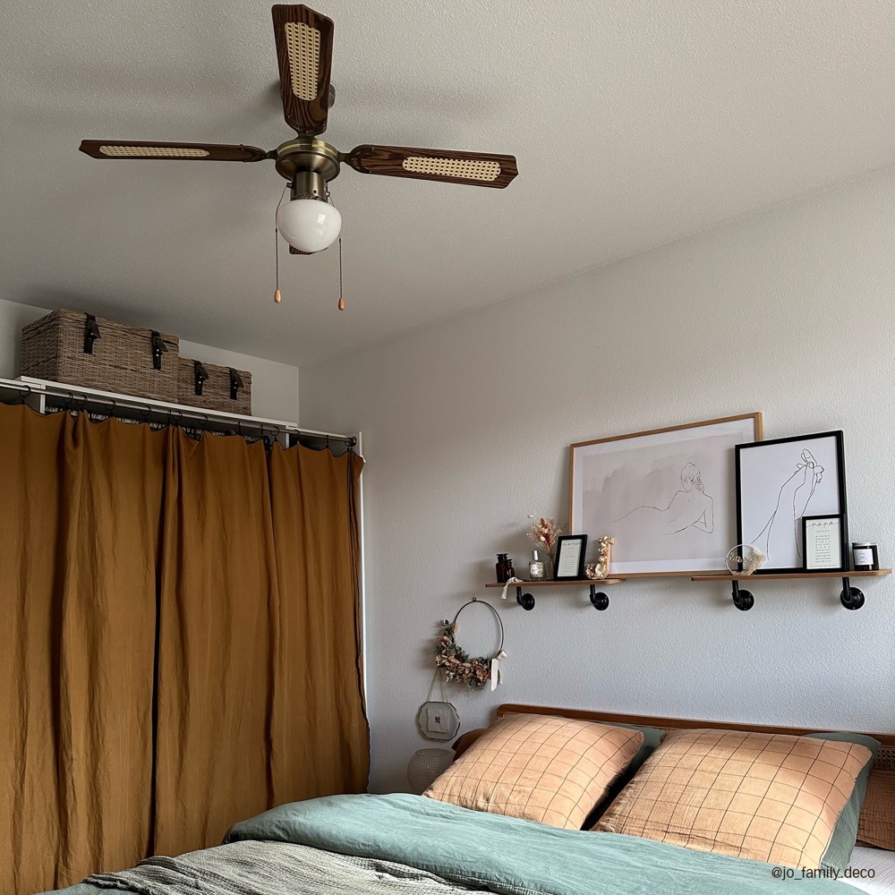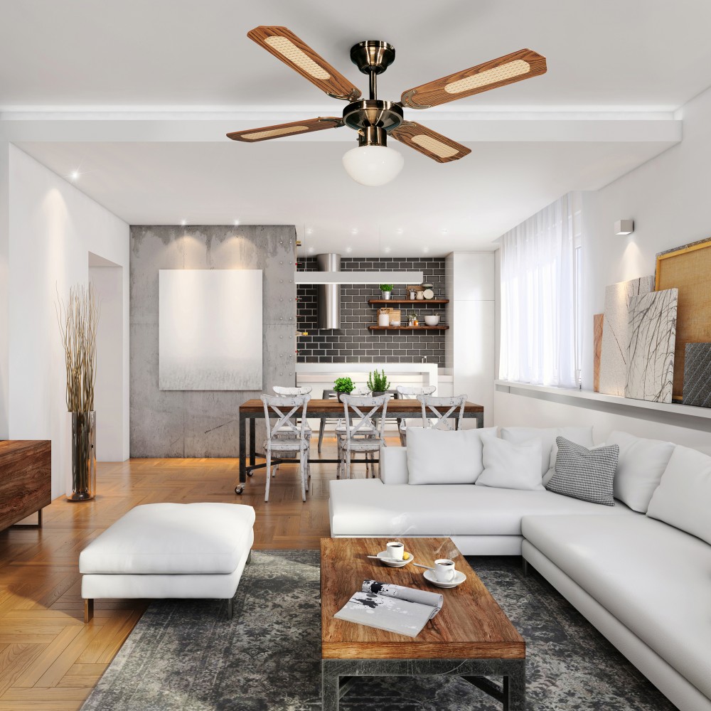 Malgré son diamètre généreux, sa finition laiton antique lui permet de rester discret tout en étant un véritable objet de décoration. Les pales cannées ajoutent une texture visuelle unique qui se marie parfaitement avec du mobilier en bois.